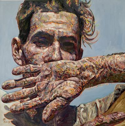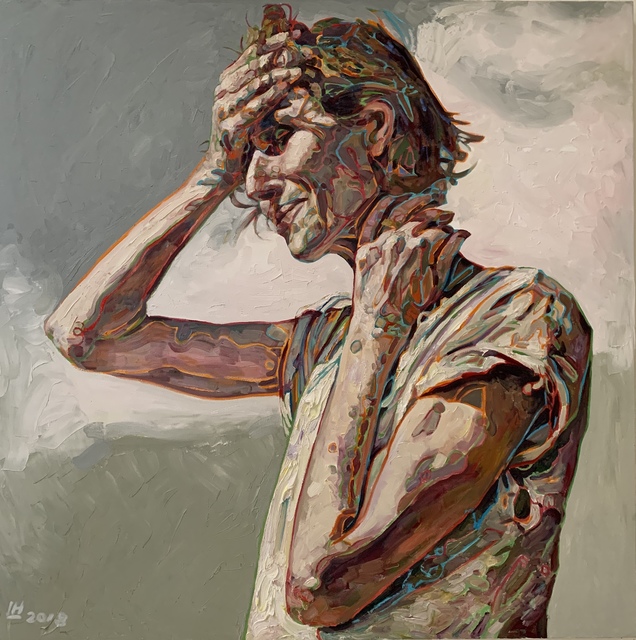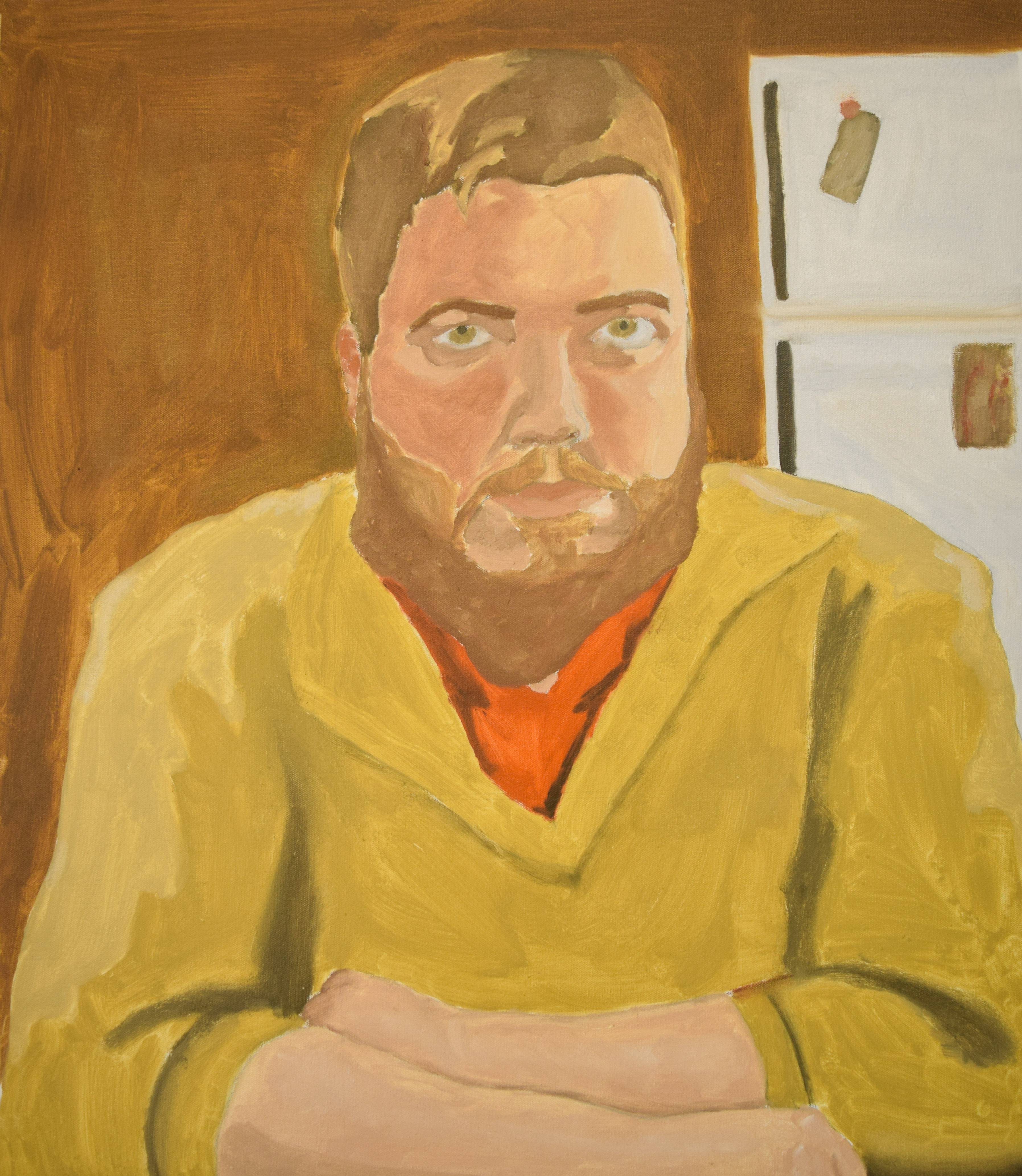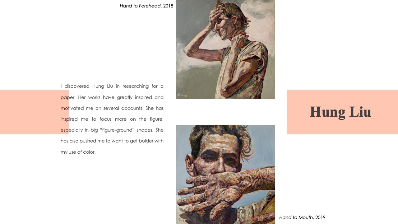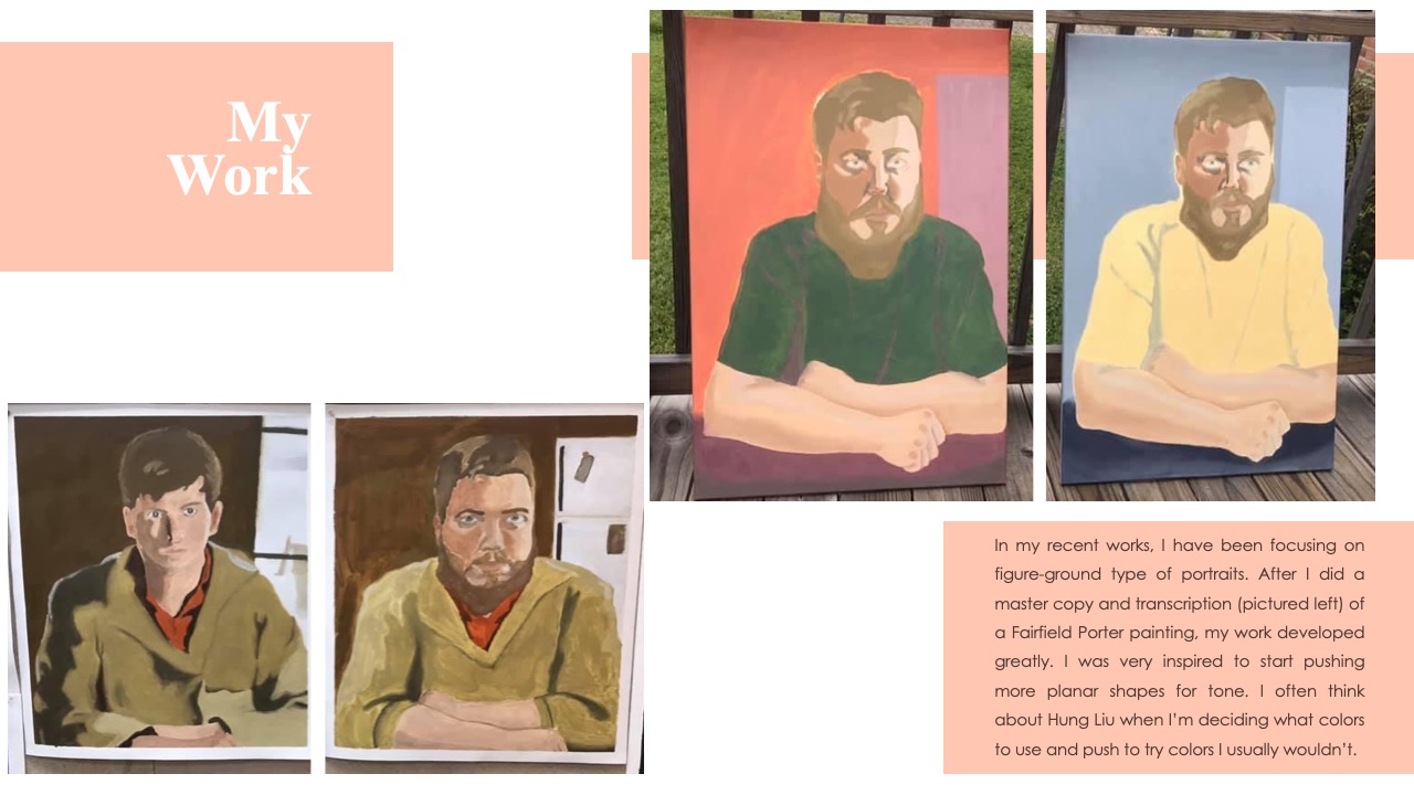 In my recent works, I have been focusing on figure-ground type of portraits. After I did a master copy and transcription (pictured left) of a Fairfield Porter painting, my work developed greatly. I was very inspired to start pushing more planar shapes for tone. I often think about Hung Liu when I’m deciding what colors to use and push to try colors I usually wouldn’t.