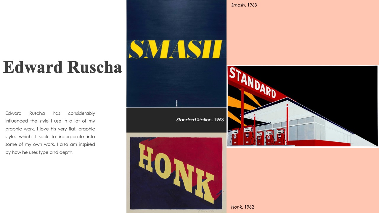 Edward Ruscha has considerably influenced the style I use in a lot of my graphic work. I love his very flat, graphic style, which I seek to incorporate into some of my own work. I also am inspired by how he uses type and depth.