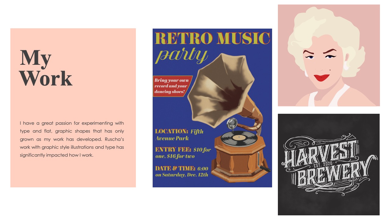 I have a great passion for experimenting with type and flat, graphic shapes that has only grown as my work has developed. Ruscha’s work with graphic style illustrations and type has significantly impacted how I work.