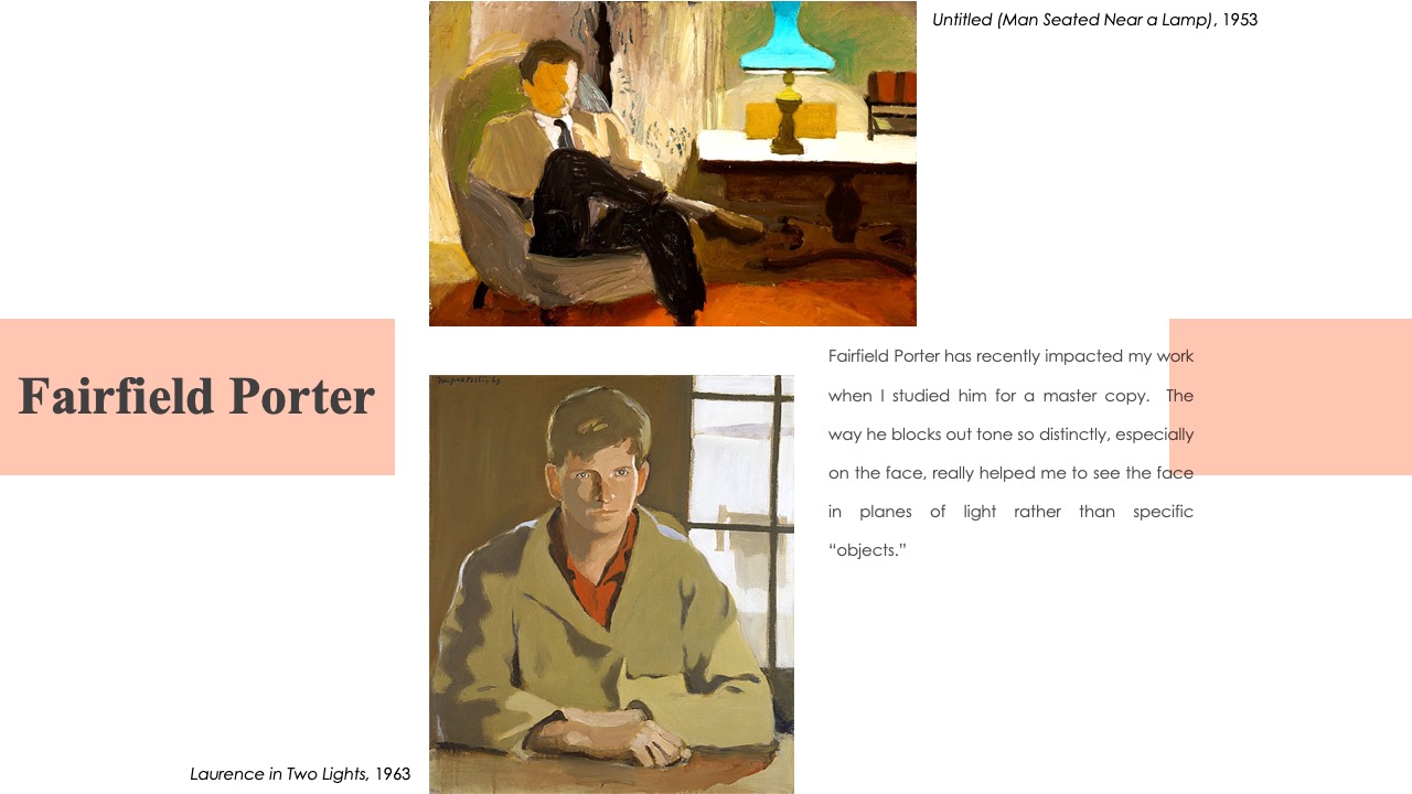 Fairfield Porter has recently impacted my work when I studied him for a master copy. The way he blocks out tone so distinctly, especially on the face, really helped me to see the face in planes of light rather than specific “objects.”