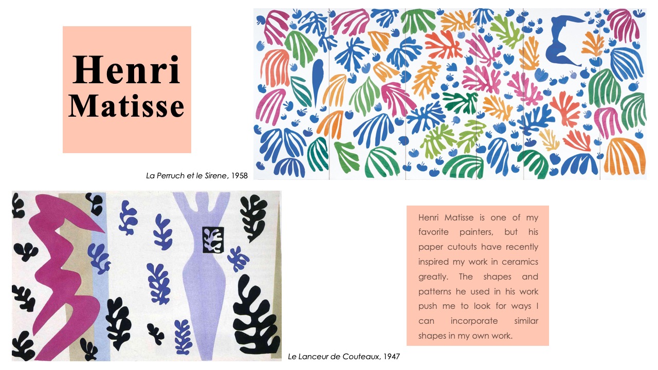 Henri Matisse is one of my favorite painters, but his paper cutouts have recently inspired my work in ceramics greatly. The shapes and patterns he used in his work push me to look for ways I can incorporate similar shapes in my own work.