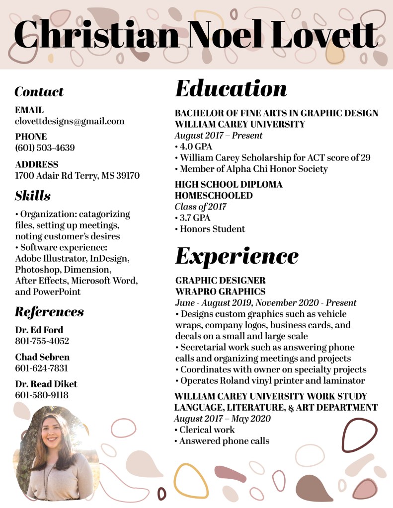 Christian Lovett was born and raised in small town Mississippi singing in church, absorbing as much 80s music as she could, and drawing on everything in sight. She still lives in the Magnolia State with her husband and their two spastic cats. She will graduate in May of 2021 from William Carey University with a Bachelor of Fine Arts in Graphic Design and wants nothing more than to grow gray with her husband and make art to the glory of God for the rest of her life.